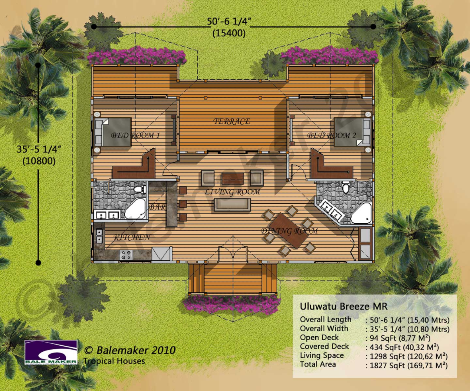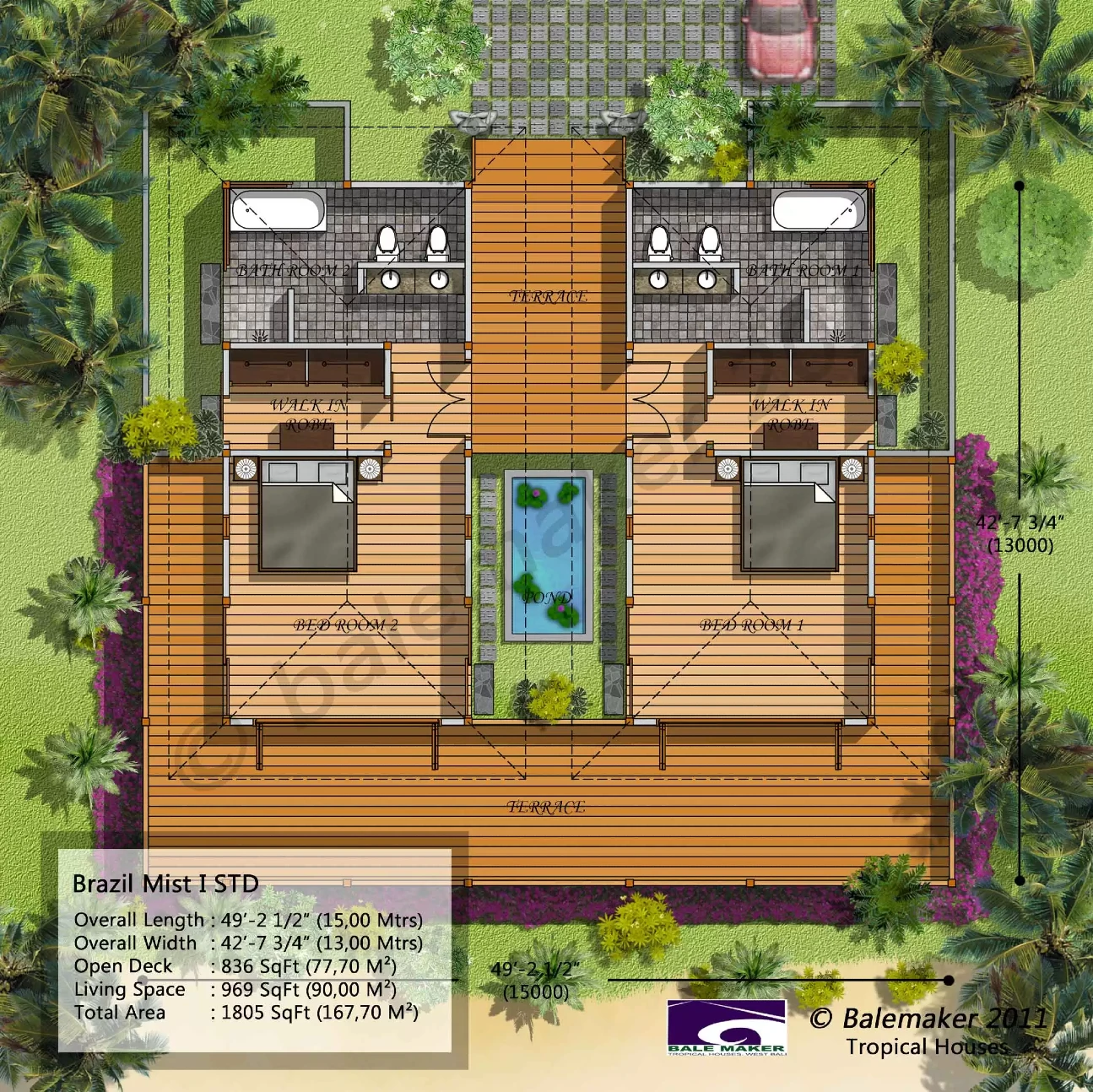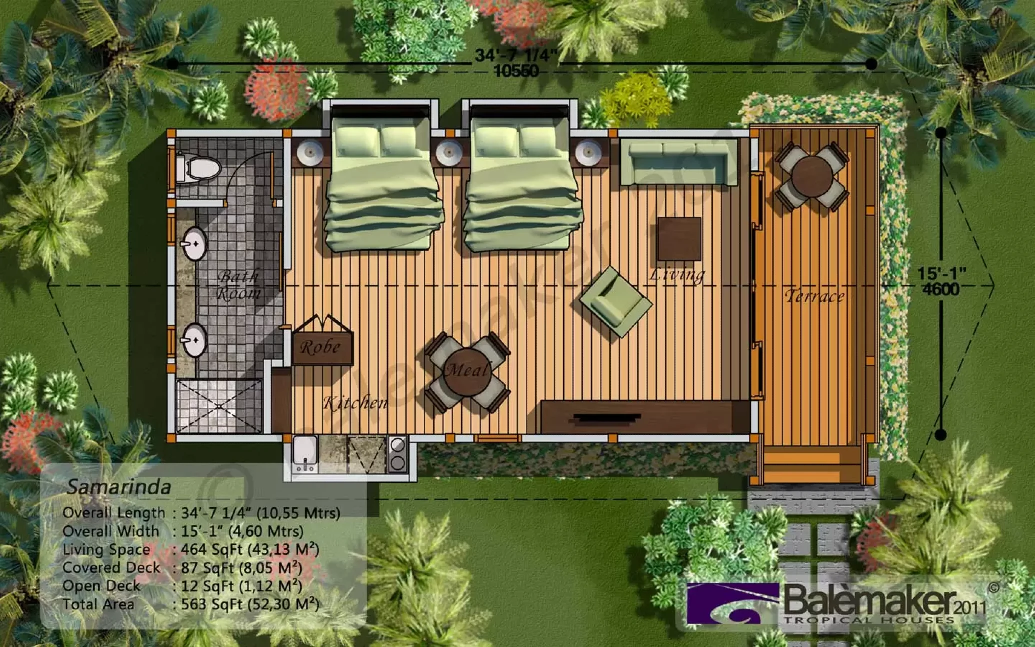 A total of 830Sqft (77m2) living space with an expansive connecting rear deck and elegant entrance deck. This tropical floor plan layout can be modified/tailored to fit any resort requirements.