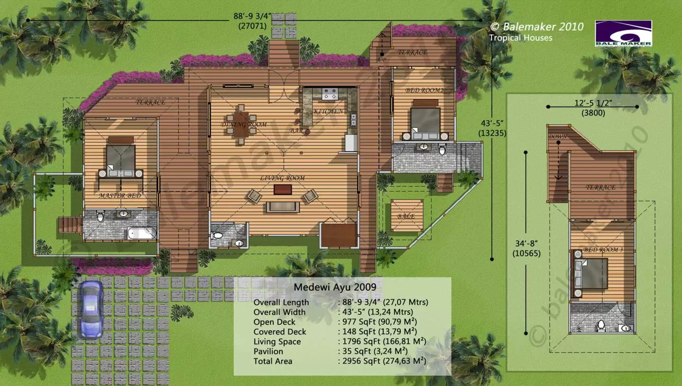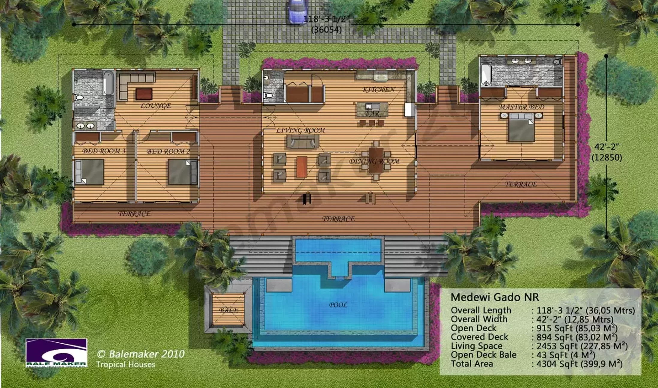 The newest updated design in our Medewi Gado series of homes incorporating three splendid pavilions with a combined living space of 2,453Sqft (228m2) and expansive covered and open decks.